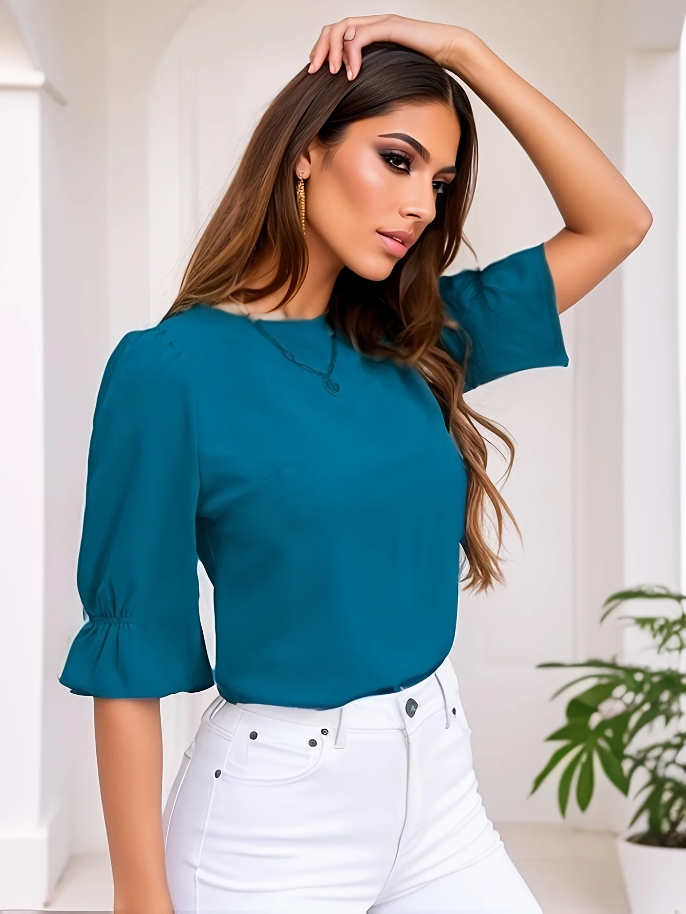 Solid Color Crew Neck Simple Blouse, Elegant Half Sleeve Loose Blouse For Spring & Fall, Women's Clothing